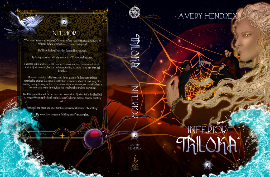 L the Studio (Lexxie–Instagram account here) has spoiled us with another fan art cover, this time for Book 2: Inferior. There are so many details pulled from the novel! The stars and desert background, Varuna’s tidal wave, and Chit’s raven form. And then you have Dushyanta’s spirit animal and the web’s brilliant design. And of course, I would be remiss not to mention the central concept of Agni/Ezra/Josiah. It’s absolutely well-thought-out and beautiful! Agni appears larger than life (which he rightfully should be 😉)